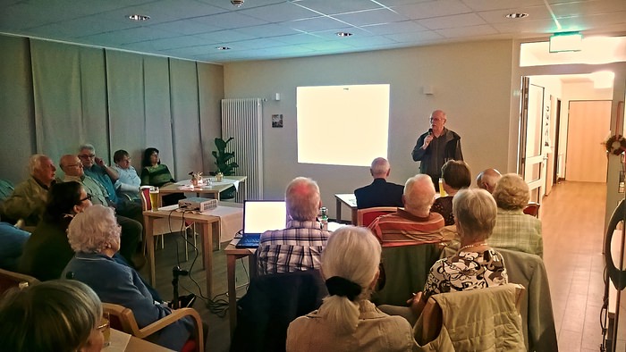 Die Veranstaltung am 18.09.2014 fand erstmals regulär im Eiberger Café der umgebauten Kirche am Schultenweg statt. Es ging dieses Mal um die geschichtliche Entwicklung der evangelischen Kirche im Eiberger Raum. Der Referent Oberamtsrat Balke verstand es, vor großem Publikum durch die ausgewählten Lichtbilder verbunden mit seinem reichen Erlebnisschatz den Vortrag sehr anschaulich zu gestalten.